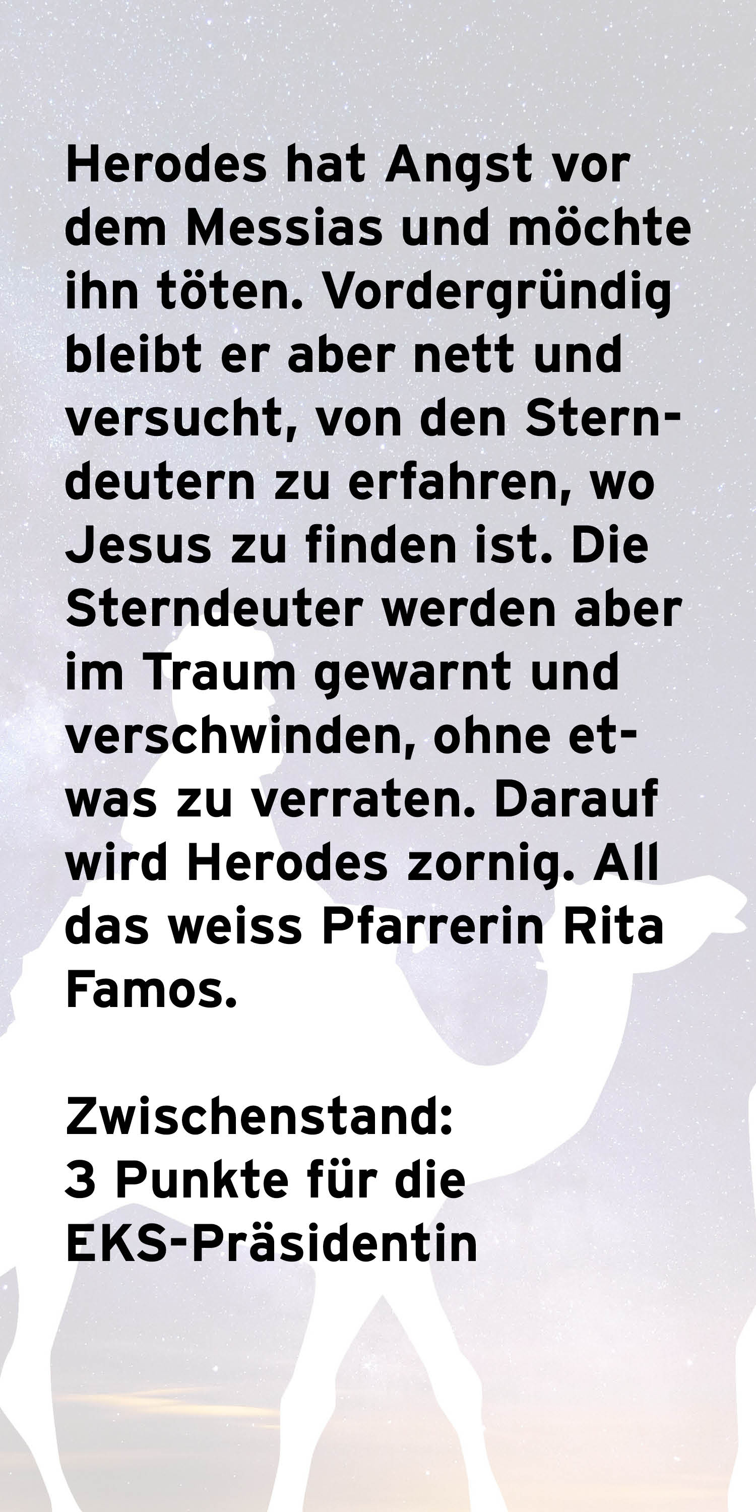 Wissen Sie über Christbäume, Zimtsterne und die Weihnachtsgeschichte Bescheid? Wer war neben Maria und Josef noch im Stall? Testen Sie Ihr Wissen im Online-Adventsquiz und erfahren Sie, ob Sie besser abschneiden als Rita Famos, Präsidentin der Evangelischen Kirche Schweiz (EKS).