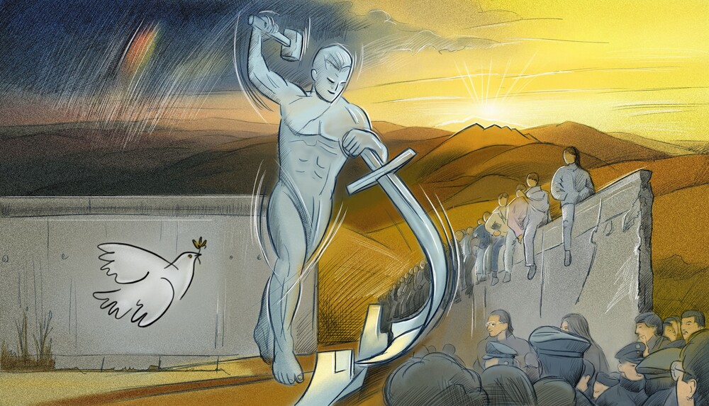 Schwerter werden zu Pflugscharen umgeschmiedet. «Es wird kein Volk mehr wider das andere das Schwert erheben, und sie werden hinfort nicht mehr lernen, Krieg zu führen.» (Micha, 4,3) Der Prophet Micha hat eine Vision, wie es sein wird, wenn Gott sein Werk vollendet und seine Herrschaft endgültig anbrechen wird.