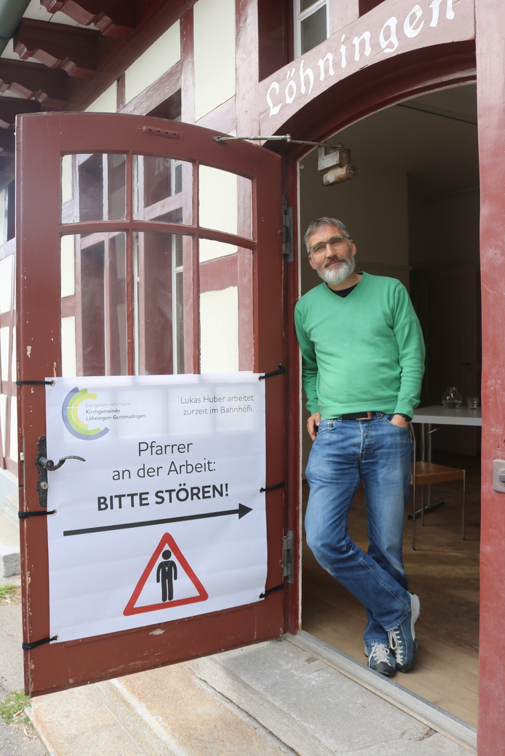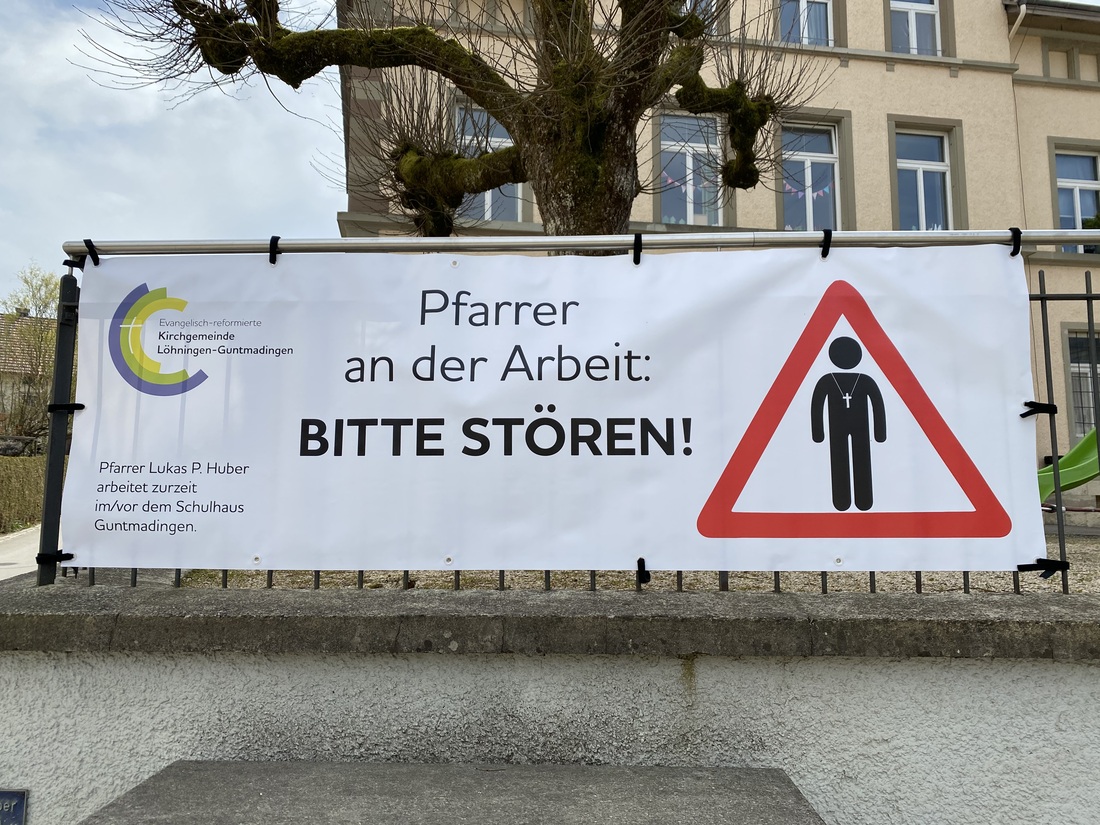 Die Idee ist alt: Schon seit 2014 arbeitet der Pfarrer im Sommer manchmal vor dem Schulhaus Guntmadingen. Initiant von «Pfarrer an der Arbeit. Bitte stören!» ist der Pfarrer der Evangelisch-reformierten Kirchgemeinde Löhningen-Guntmadingen im Kanton Schaffhausen, Lukas Huber. Die Idee für den Werbespruch hatte ein Journalistenfreund aus Basel.